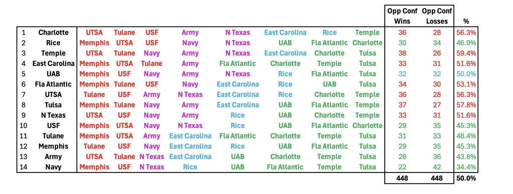 No team draws all four of the powers but I list 7 teams in the top two categories and Charlotte, Temple, Rice, UAB all face 5 of the 7 teams with Charlotte facing only one GREEN team. Tulane, Army and Navy all face 4 GREEN teams and just two red teams.