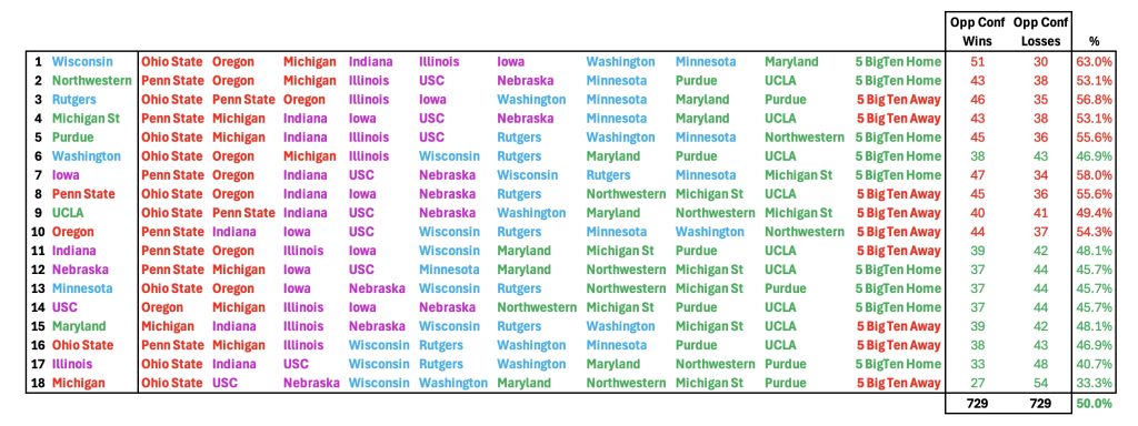 Three teams draw 3 of the top 4 teams and they are Wisconsin, Northwestern, Rutgers and Washington. Last year Rutgers was the only team in the Big Ten that did not face Ohio St, Michigan, Penn St, Oregon or Iowa and this year face Ohio St, Penn St, Oregon and Illinois.