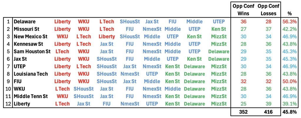 The above category has some flaws. For example, both Sam Houston and Jax St had great records last year at 6-2 and 7-1. Both teams are practically brand new this year losing the majority of their starters and have new head coaches. Also, Liberty last year was 5-3 so you would get credit for playing a middle of the pack team this year but Liberty was a couple of plays away from playing in the title game and do look like the top team in the league this year.