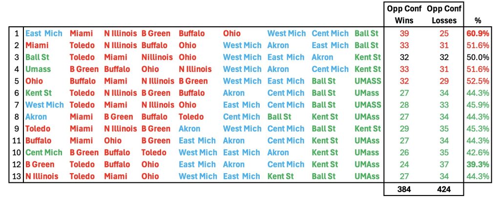 Eastern Michigan plays FIVE top level teams and face just one of  the easiest teams in the league and you can tell that by their opponents record. Ohio and Miami who faced off in the MAC title game last year both face 4 RED teams as does Ball St, UMass, Western, Kent St and Akron.