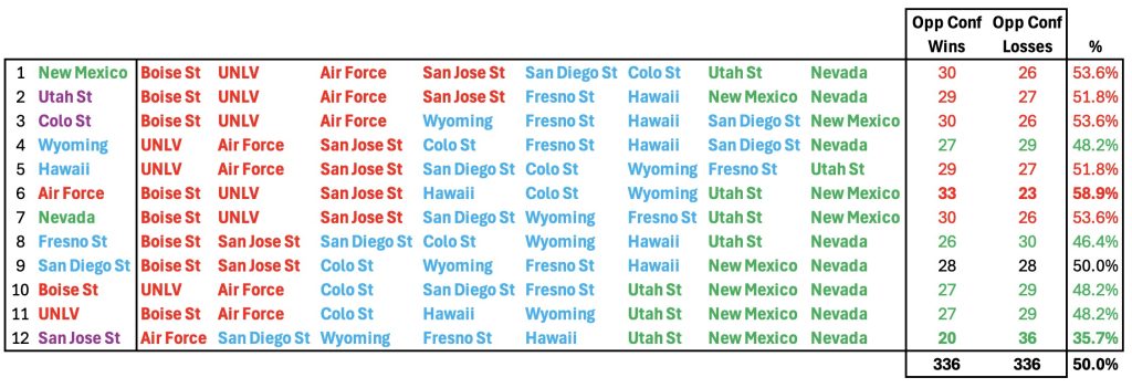Ironically New Mexico and Utah St are the two teams that face all 4 of the MW’s top teams this year.  Five teams face 3 of the top teams.  Four teams only face two of the top 4 teams and UNLV and Boise are among those. San Jose St avoids UNLV, Boise St and does not play itself so they only face one RED team and are one of 3 teams that face all three GREEN teams.