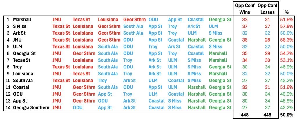 Marshall draws the toughest schedule facing all 4 of the leagues “powers” and they of course do not get to play themselves. This is a rebuilding Marshall team facing the leagues toughest schedule. Southern Miss, Arkansas St and JMU all face 3 of the leagues powers and Southern Miss and Ark St do not face either of the Green teams. Nine teams face two of the top teams in the league and the team with the best schedule is Georgia Southern which does draw JMU but avoids Louisiana and Texas St and draws both the Green teams.