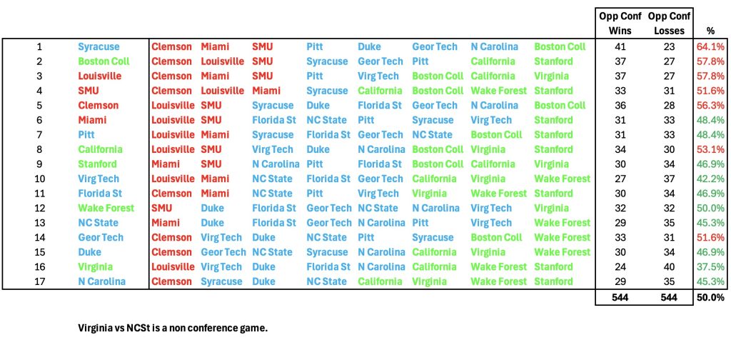 Today I we look at the ACC. The ACC plays an 8-game schedule and so no team has an edge with extra home games or fewer away games unlike the Big Ten and Big 12 which play nine game conference schedules.