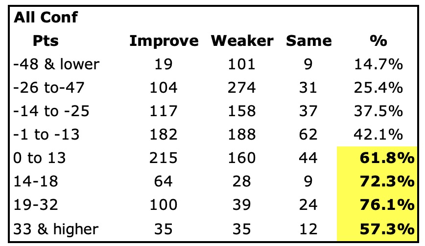 I have been doing this chart since 2009, so it has 16 years of research. There have been 128 teams that have accumulated -48 points or more and only 19 of them managed to improve their record (just 14.8%). When a team has between -26 and -47 points, they have only improved their record 104 out of 409 times (basically 1 out of 4 chance). The surprising part is at the other end of the spectrum. Teams that return the most points (over 33 pts) have only improved their record 35 out of 82 times which is surprising. In ‘24 the teams were 3-1-1 in improving their record going against that trend and more to what you would think. Last year the there were two teams in this category. Clemson had their record drop but Indiana was at the top of the chart and went from 11-2 to 16-0 and National Champs!!! This year Notre Dame is at the top of the charts so can they do the same? Other than that, the chart does what is expected. Teams that are between 0 and +32 have improved or had the same record 66.8% of the time. The best performing category is +19 to +32 points as only 39 out of the 163 teams had a weaker record the next year (1 out of 4). Teams in the +14 to +18 category have improved or had the same record 72.3% of the time and teams in the 0-13 range are at 61.8%.