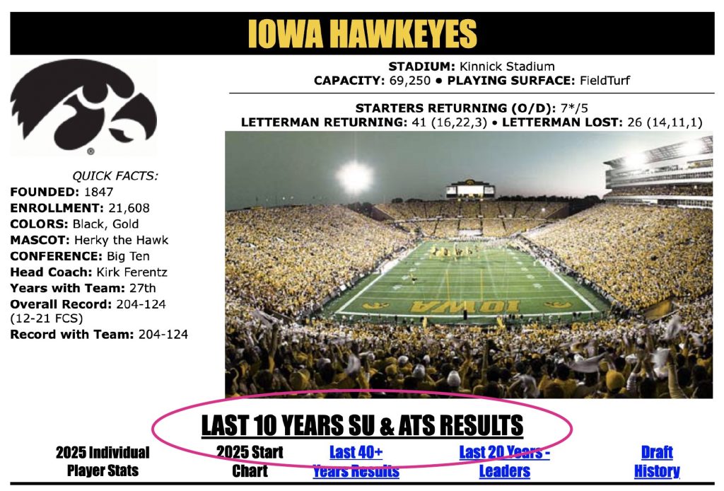 Another fine feature of Phil Steele Plus that is updated for 2025 is the last 49 YEARS Spread records for each team (dating back to 1976). Also included on that page are the last 37 years stats for each team (magazine has last 6 years) plus the conference records and who the coach was each year since 1988. Here is a picture of the three pages on Kansas and you can follow and see how the different coaches like Glen Mason, Terry Allen, Mark Mangino, Turner Gill, Charlie Weis, David Beaty, Les Miles and Lance Leipold did in each of their years as the head man. Here are the three Kansas pages.