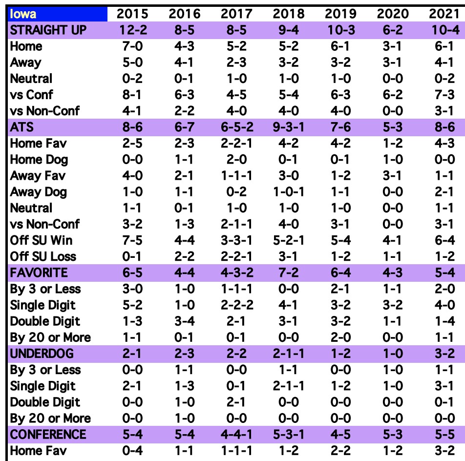 The first section to show you the full page is the Last 10 years Spread results in 39 different categories. The magazine lists the spread records in 9 different categories but this chart goes much deeper. Here is a sample of the Iowa pages and the difference between the two boxes. I the magazine if you add up Iowa’s record as an Home Favorite and Away Favorite you see that they are 47-35-4 as a favorite overall and 48-39-4 ATS vs the Big Ten. This chart allows you to drill in a little deeper. Check out Iowa’s record as a favorite of 3 or less, it is a super 12-31 and they are 24-12-2 ATS 67% overall as a single digit conference favorite. However, make Iowa a double-digit conference favorite and they are just 8-13-1 including 0-1 ATS as a 20+ conference favorite. It is the same as a dog as Iowa is 12-7-1 ATS as a Single Digit conference dog but 3-7 ATS as a double digit conference dog. This chart allows you to get deeper into the spread numbers for ALL 136 teams.