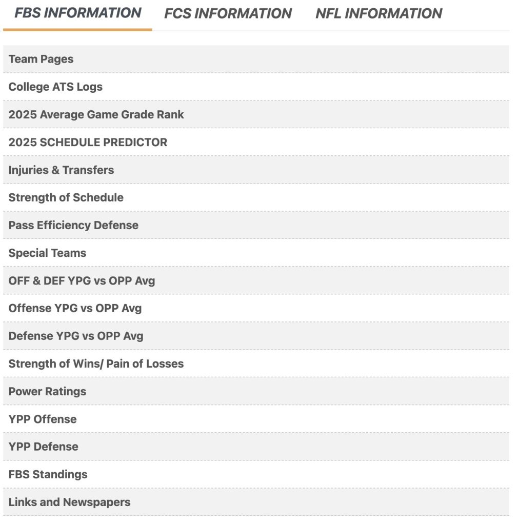 All this is available for all 138 FBS teams and for the 126 FCS teams as well. There is a ton of more information as here and we the exact same stuff for all 32 NFL Teams. Here are the menus you have to choose from for FBS, FCS and NFL on Phil Steele Plus with the team pages having all the information I just detailed. VIP members get bull access for the months of June, July, August and September for FREE.