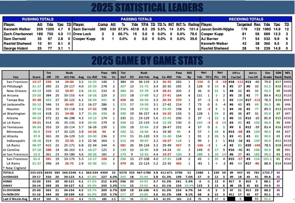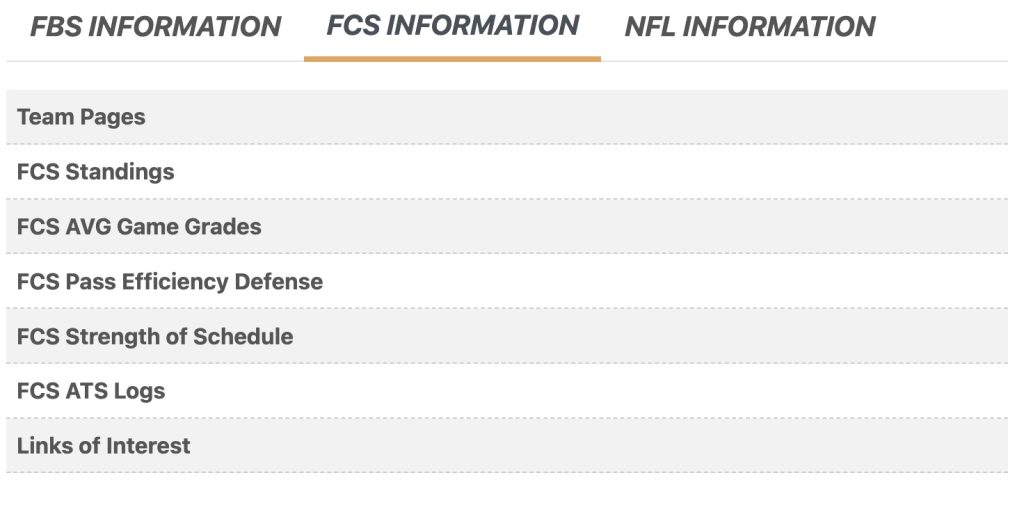 You get the same individual game stats that are in the magazine not only for the previous year but for the last 17 years. Even better they are color coded in GREEN for good numbers and RED for bad numbers. You can tell immediately if a team is strong or weak running the ball or stopping the run. You get an individual Game Grade on every game. The Individual Game Grade does not have a starting point for the team. It only considers the stats put up and the opponent. Let’s say both Ohio State and Bowling Green played Akron, and each had a 500-200-yard edge and won 45-3. They would each have the exact same Individual Game Grade as this number is unbiased. These numbers are updated each week on Sunday! These numbers including an Average Game Grade are also updated each week, color coded for the FCS! They are also updated weekly and have the Average Game Grade and are color coded for the NFL!