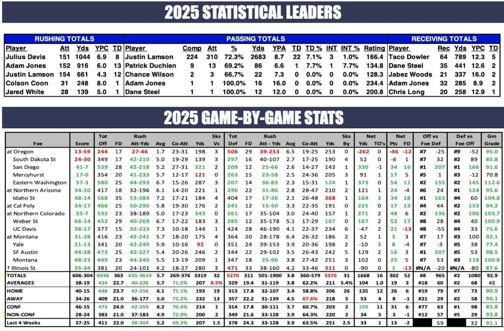 You get the Individual player stats not only for this year but for past years. Want to know what your QB did vs this week’s opponent last year and the year before. You can look it up quickly. We update these numbers each week during the season not only for the FBS but the FCS as well! If you are a Fantasy Football player, we have these for the NFL as well and have the Individual Game stats all the way back to 2013 (14 years!)