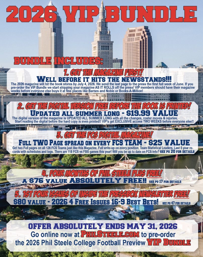 Go online now at PhilSteele.com to pre-order the 2026 Phil Steele College Football Preview VIP Bundle and beat the price increase. On March 1 the price goes up to $44.95 but right now in February you can get the VIP Bundle at last year’s price of just $39.95! CLICK HERE TO SIGN UP TO BECOME A VIP MEMBER.
