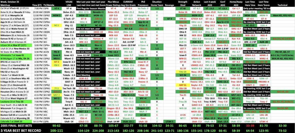 Last met Score – A six-point difference. Example if you lost by 3 on the road last year and are now at home you would win by 3 at home with the home field edge shift. If a block is in all Green it is 7+ point away from current line and is a Best Bet. In this example from October 25th last year this column had 16 best bets in this slice of games and went 10-6. In this example Iowa beat Minnesota by 17 on the road in ‘23 and now with the 6 point shift should win by 23 and they were favored by just 8.5. Last year this was a Best Bet on Iowa and a winner. Last year this category went 88-76 one year after going just 65-72 on Best Bets. If the teams did not meet last year it is in Black and a no play.