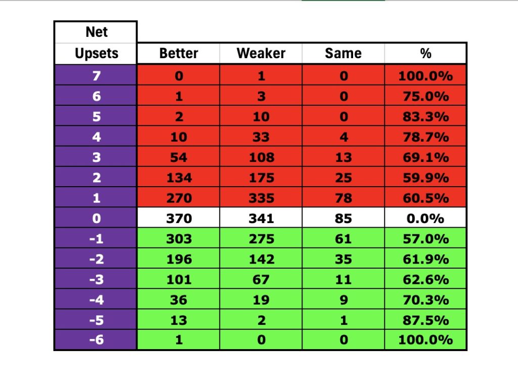 The results coincided with my original predictions as in the last 33 years, teams that pulled 3 or more NET upsets (upset wins minus upset losses) the previous year have seen their record get weaker or stay the same 172 out of 239 times for a 72% success rate. On the opposite end, teams that had a -3 or more net upsets the previous year have seen their record improve or stay the same on 172 out on 259 occasions for a 67% success rate.