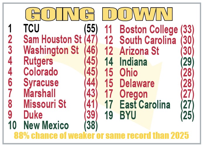 At the other end of the spectrum is the Going Down box or the teams that face much tougher schedules. I expect these teams to have a weaker record the next year as the opponents are much tougher. In 2024 I listed 16 teams in the Going Down Box and of the 16 only ONE managed to improve their record and that was New Mexico which went from 4-8 to 5-7! Last year I listed 19 teams in the Going Down box and 15 of those teams had a weaker record with only 4 teams improving their record like BYU which went from 11-2 to 12-2 playing one extra game. That means the last two years out of the 35 teams in the Going Down Box, only 5 managed to improved their record (2 of those by just 1 game) for 85% success rate.